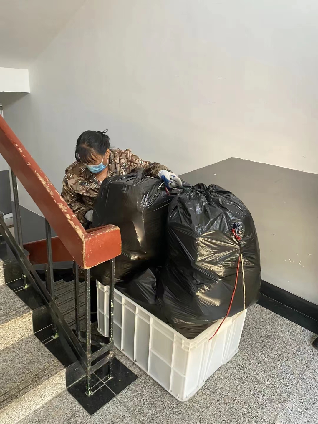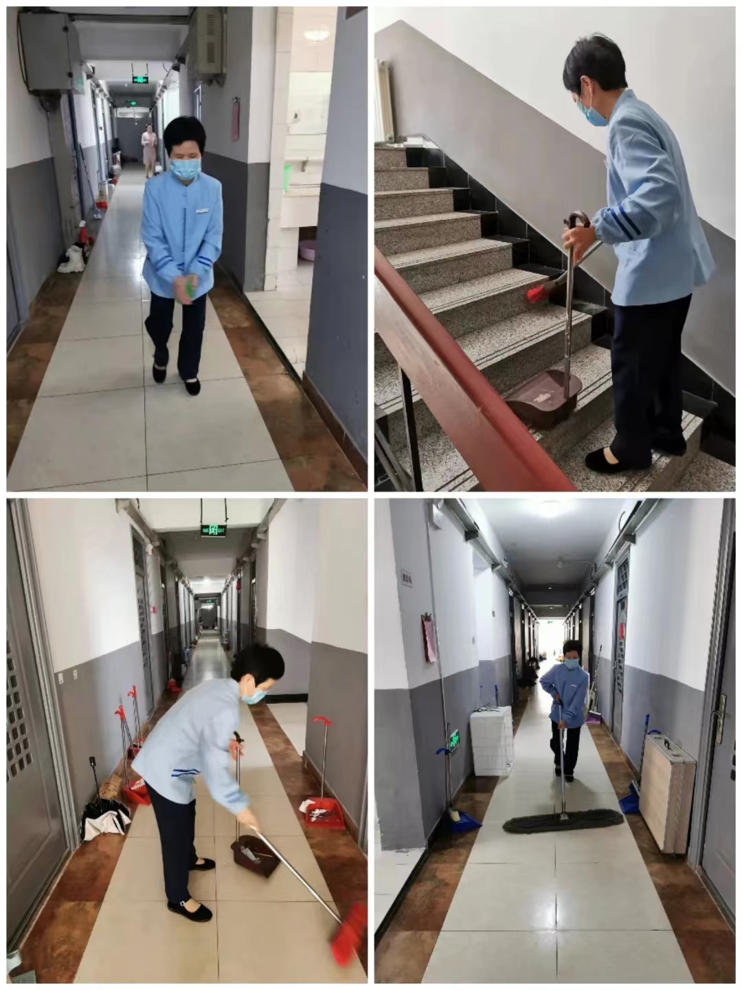 为抵御疫情,保护学校师生的安全,我校全面实行线上教学。洗漱休息之外,宿舍摇身一变也成为了学生上课和用餐的场所,使用时间大大增长。相比封校前产生的生活垃圾量更大,消毒任务也更加繁重。文东校区一号女生公寓的两位保洁阿姨,康阿姨和任阿姨每天准时无误的进行着一日三清理三消毒的工作,不辞辛苦清理每一层的地面、楼梯、水池、卫生间、洗澡间,并喷洒酒精、二氧化氯等消毒液仔细消毒;每日将五层楼的垃圾从上到下搬运到宿舍楼外堆放处,积极配合学校的防疫工作。我们目所触及是干净安全的生活环境,转头是她们瘦小但有力量的背影。
