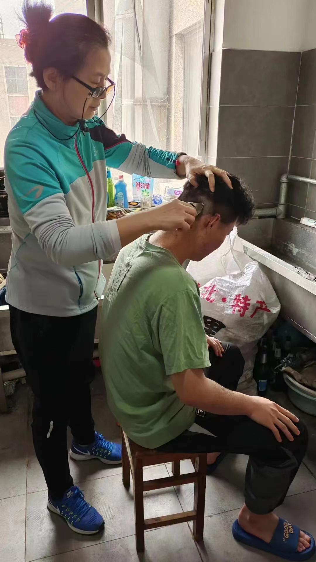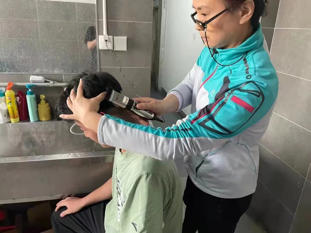 封校日久,在校男生头发半长不短,看起来不修边幅。恰逢春暖花开,济南进入升温快车道。看到同学们有需求,文东校区男生公寓楼长热心的郭阿姨拿起理发工具,化身发型总监帮助男同学修剪头发。郭阿姨技术不凡,温柔细心,像对待自己的孩子一样为同学理发,为同学们解决燃发之急。