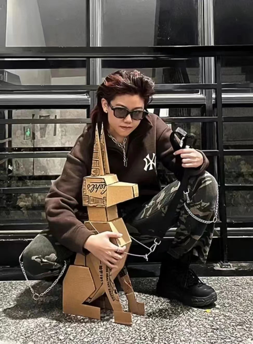 创作阐释:遵循”旧物新造”的理念,将废弃的快递纸箱盒进行裁剪和粘贴,组装成一只昂首挺胸的杜宾犬,赋予其新的生命,同时享受发挥想象力的美妙时刻。杜宾犬的身体结构健壮而稳定,性格坚定机敏,勇敢而顺从,具备一定攻击性。通过用墨镜和粗项链对其进行装饰,更凸显了它的酷帅感以及敢于直面挑战的信念感。对千斤的创作也体现着我本人敢闯敢拼,迎难而上的性格特点,它如同我的精神伴侣,满足现实中陪伴的缺失,给我带来很多的快乐。