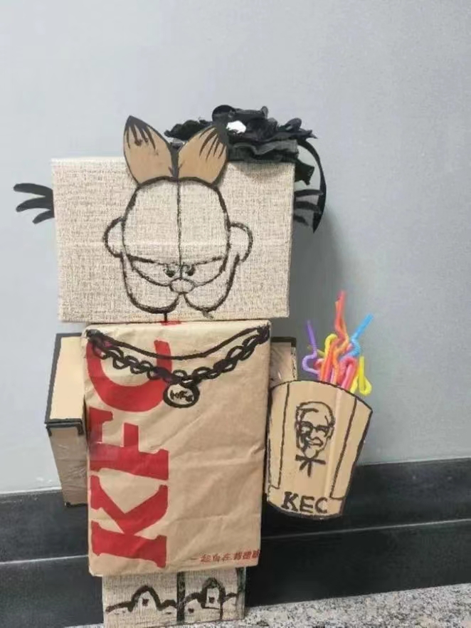 创作阐释:我们本着“废物利用”原则,充分利用快递纸壳和用过的塑料袋进行旧纸壳改造,做了一个外表帅气的杜宾犬纸壳狗。