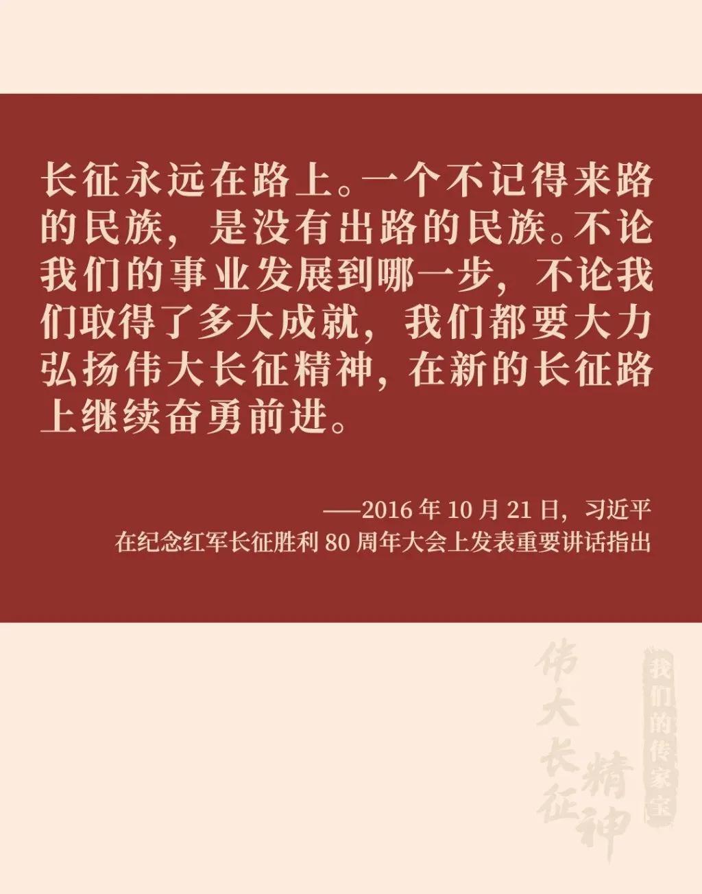 2016年10月21日,在纪念红军长征胜利80周年大会上的讲话中,习近平总书记指出:“长征的胜利,靠的是红军将士压倒一切敌人而不被任何敌人所压倒、征服一切困难而不被任何困难所征服的英雄气概和革命精神。”