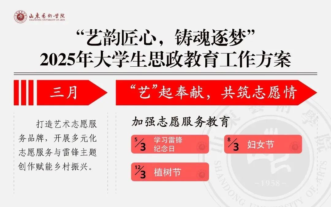 2025年是教育强国建设全面布局、高位推进之年,学生工作部(处)实施《“艺韵匠心,铸魂逐梦”大学生双线“艺术 + 思政”教育方案》,按照“一月一主题”的规划,实现主题全覆盖,紧密贴合新时代大学生的思维模式和生活状态,切实落实新时代立德树人工程,以思政教育引领学生青春航向,助力青年学子德智体美劳全面成长。