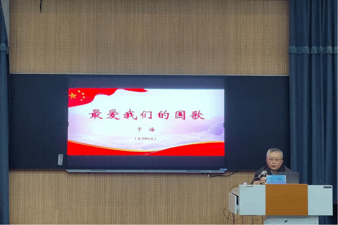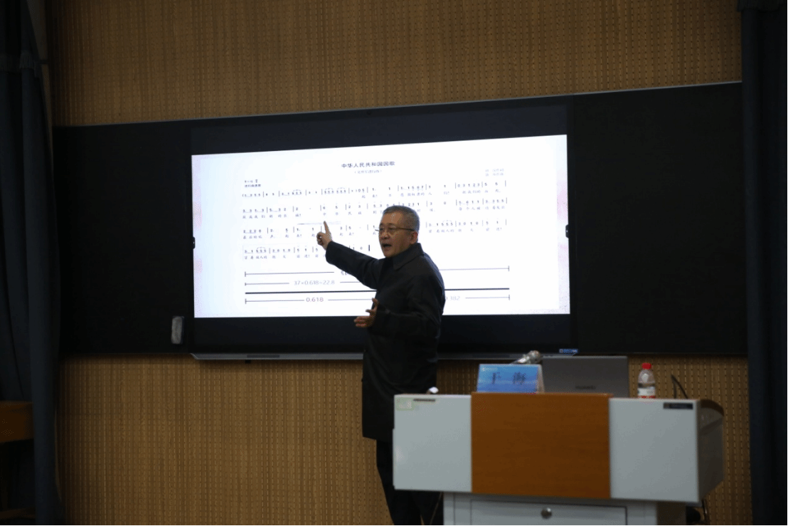 以国歌故事厚植爱国情怀,以艺术元素融合思政教育。于海以“七一勋章”获得者吕其明与音乐的故事为导入,深情讲述了《义勇军进行曲》的创作背景和传播历史,带领大家赏析了国歌歌词和旋律的深刻美学意蕴。国歌是国家的声音标志和象征,民族精神的集中体现,是神圣不可侵犯的音乐经典。诞生于抗日战争时期的《义勇军进行曲》,由田汉作词、聂耳作曲,彰显了中国共产党领导全国各族人民为争取民族独立、人民解放和实现国家富强、人民幸福而不屈不挠、英勇奋斗的崇高精神。结合他亲身参与国家庆典和外事活动的经历,他动情地说道:“我们的国歌是最好的国歌!”