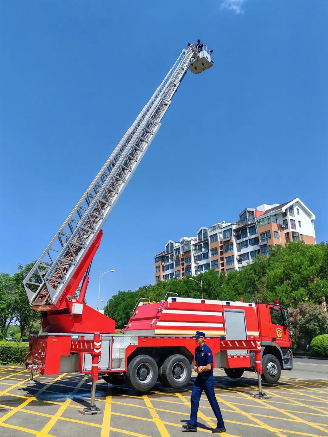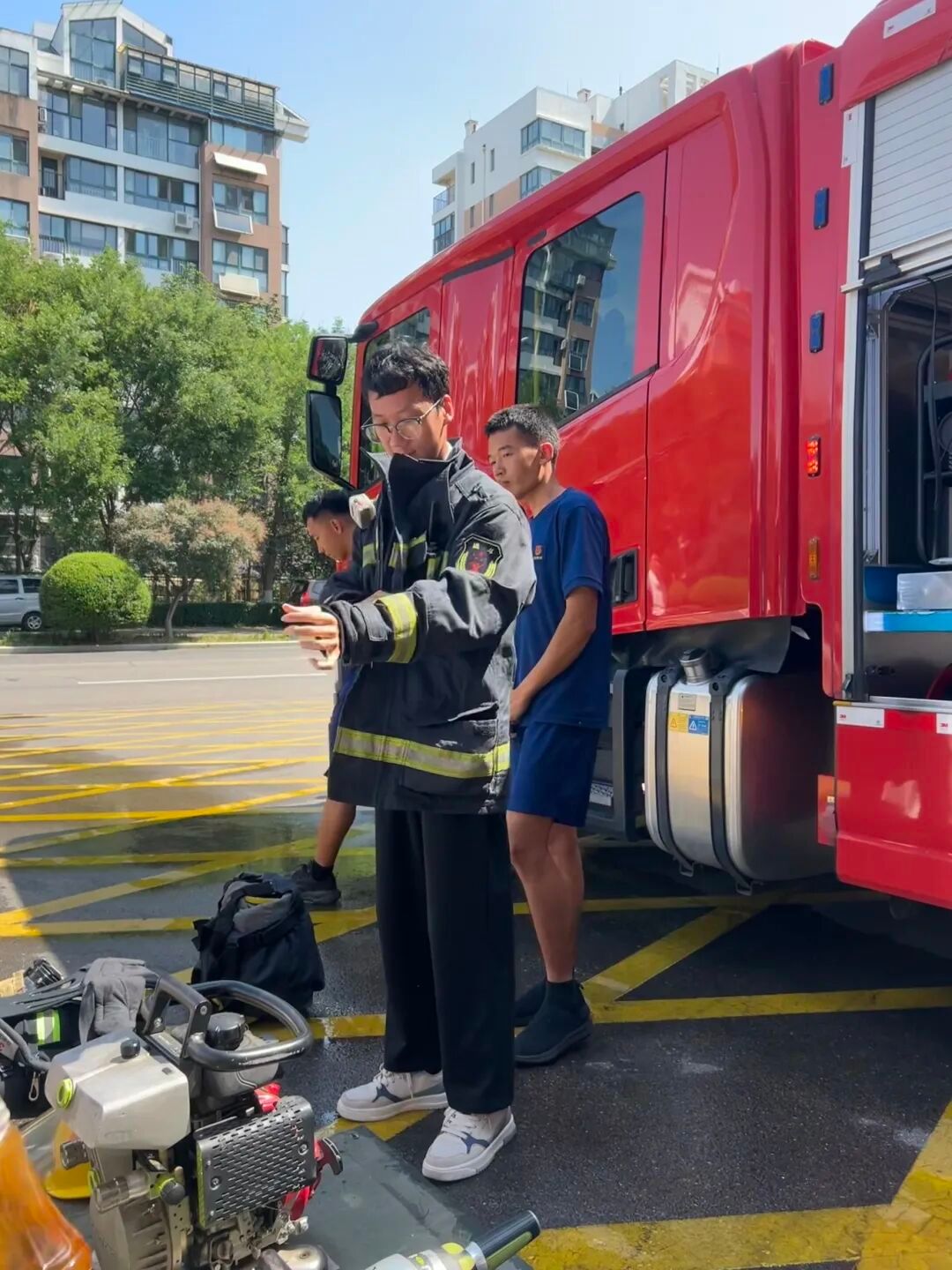 互动体验环节,大家亲自穿上防火服感受其重量与材质,提起液压剪体验“快速破障”,登上云梯车感受“高空救援”,端起高压喷射枪化身“火中英雄”,近距离感受消防救援队伍的职责与使命。