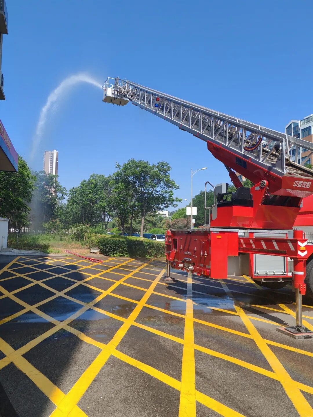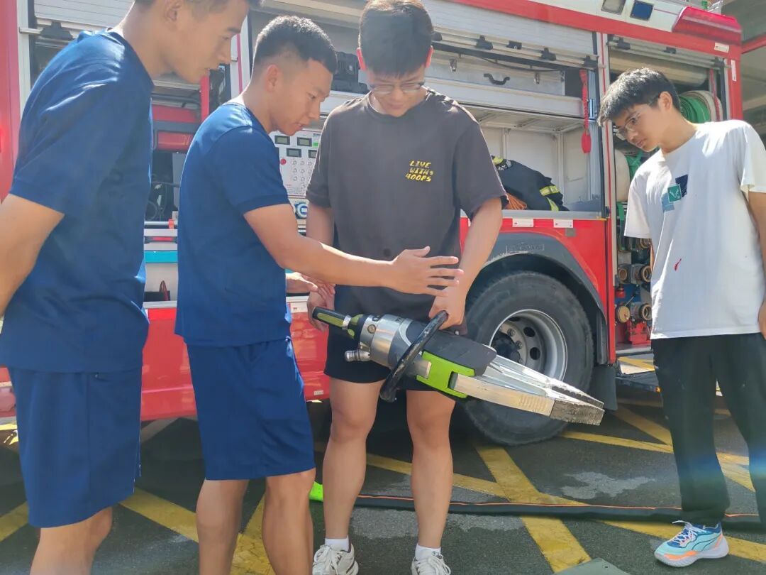 讲解演示环节,面对新奇的消防车辆、液压剪、切割机、高压喷射枪、无齿锯等装备器材,学生们兴趣高涨,提出相关疑惑问题。针对提出的问题,消防员不仅讲解了消防车辆的装备性能,展示了救援器材的操作使用方法,还表演了登高云梯升降的专业技能。