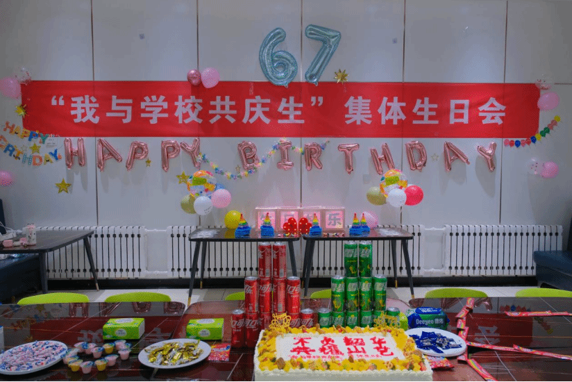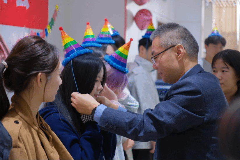 苏茂兴亲切地为过生日的学生代表戴上生日帽,全场师生共同合响《生日快乐歌》这不仅是对过生日的学生的祝福,也是对学校建校67周年的祝福。随后,师生们还共同唱响校歌——《走进校园》,歌声中饱含着对母校的深情与自豪,歌声从祝福走向告白,将个人生日汇成对母校的青春盛典。