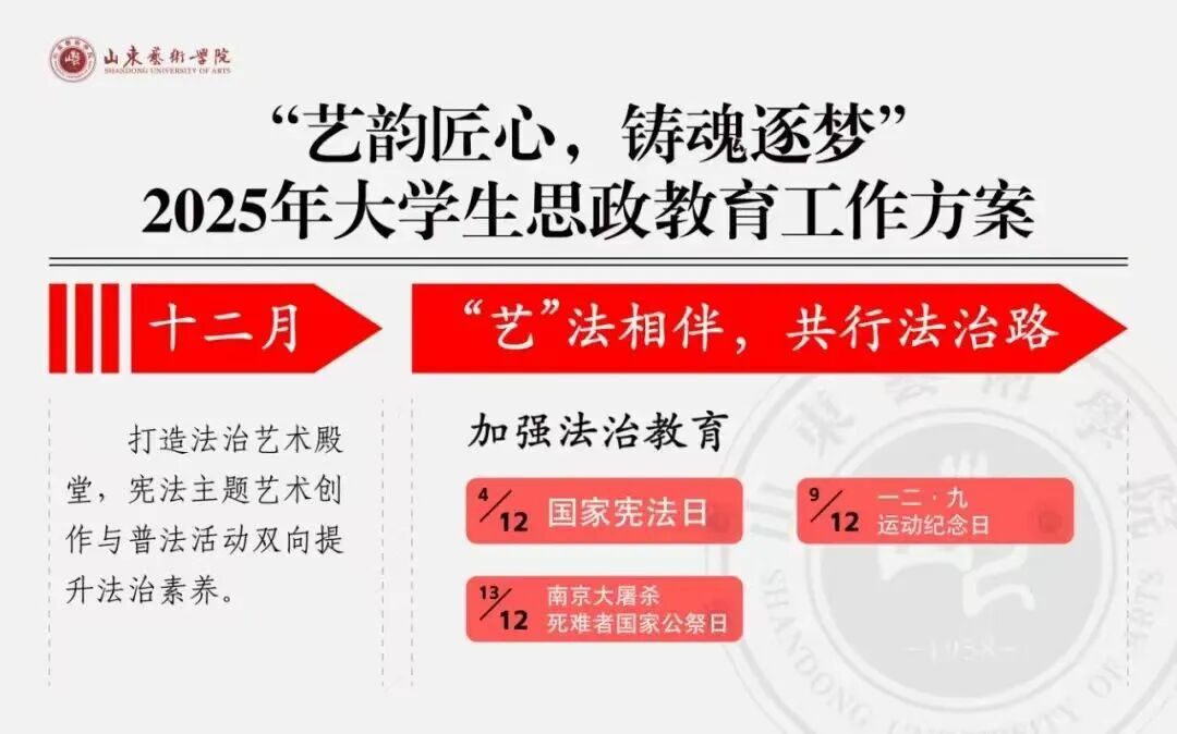 2025年是教育强国建设全面布局、高位推进之年,学生工作部实施《“艺韵匠心,铸魂逐梦”大学生双线“艺术+思政”教育方案》,按照“一月一主题”的规划,实现主题全覆盖,紧密贴合新时代大学生的思维模式和生活状态,切实落实新时代立德树人工程,以思政教育引领学生青春航向,助力青年学子德智体美劳全面成长。