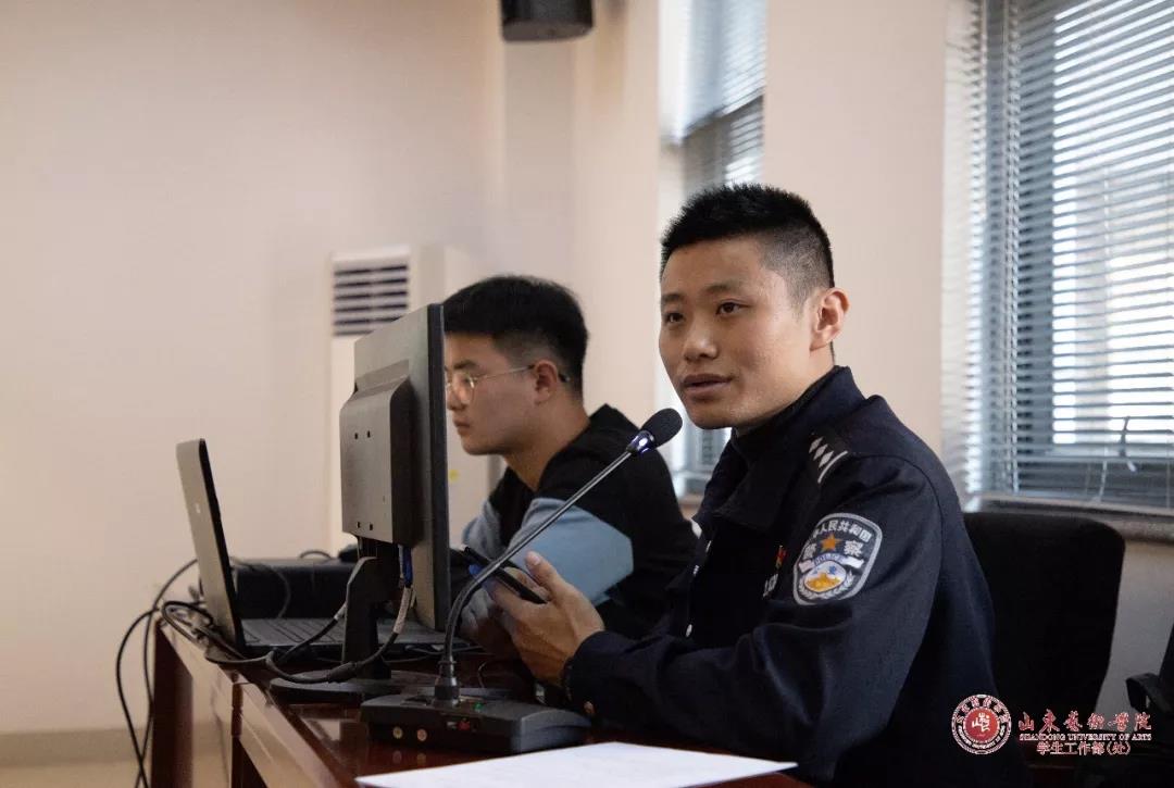 保卫处处长黄连修通报了山东艺术学院十月、十一月发生的8起学生安全案件,并以此为例,就元旦、寒假前安全工作的注意事项进行了安排部署。长清区公安分局两位警官对长清区各高校近期安全案件情况进行了梳理,从案件发生原因、解决办法、学生警示等方面展开交流,对长清公安推出的八爪鱼校园安全APP进行了介绍。