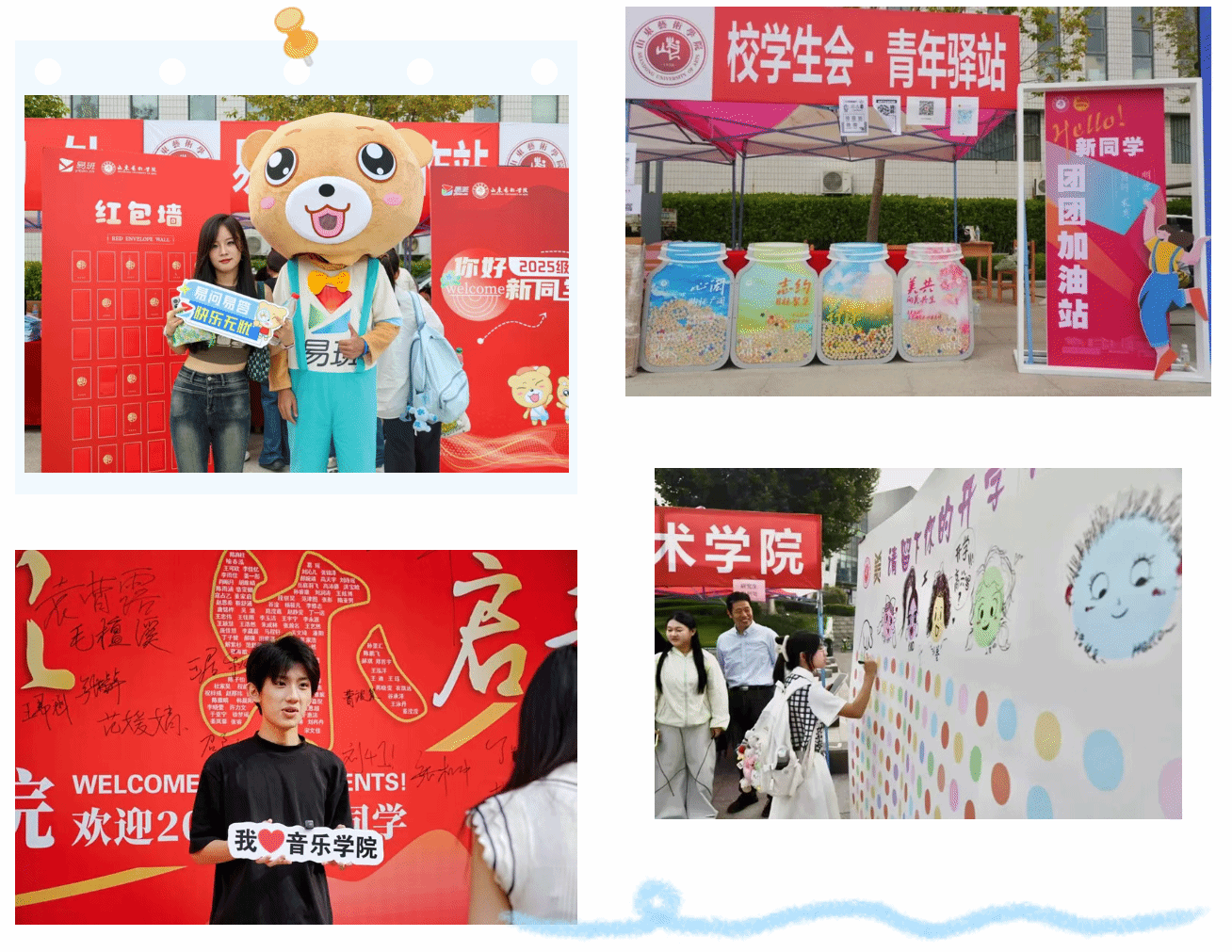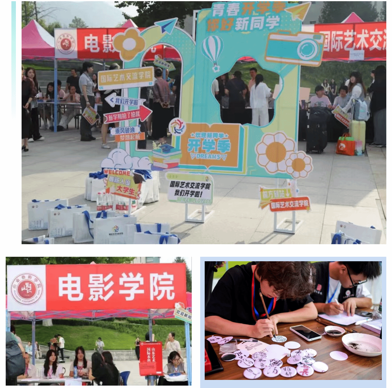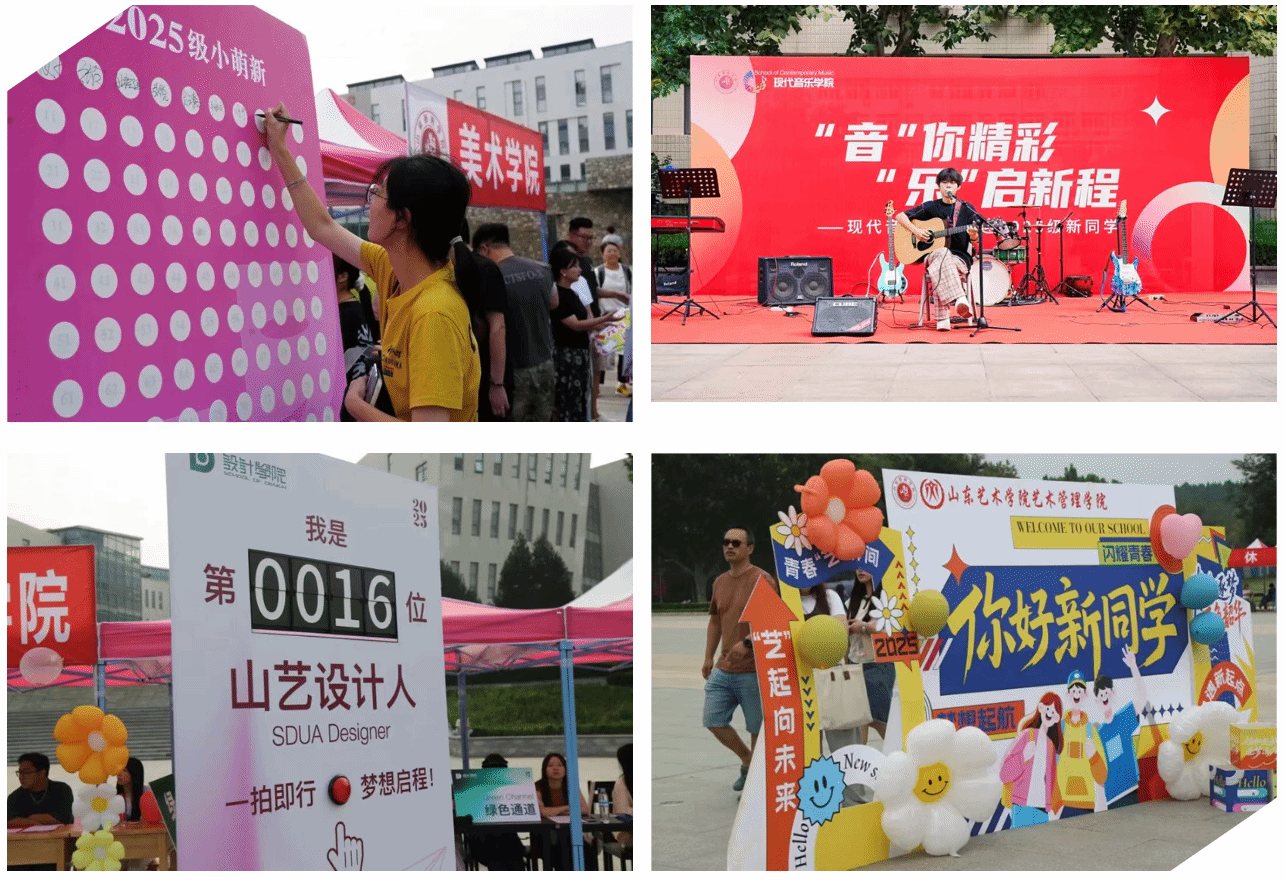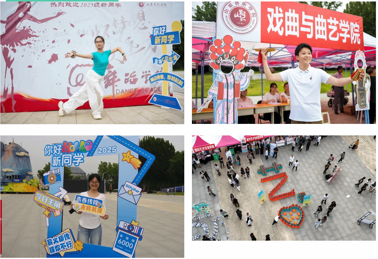 校级组织与学院齐心协力,发挥专业优势,打造一系列富有创意的迎新场景。校团委精心设置了“我是大学生”许愿瓶,开启对未来的美好憧憬;学生处推出了趣味十足的“易问易答”红包墙抽奖活动,在互动中帮助新生快速熟悉校园,寓教于乐。音乐学院和现代音乐学院分别献上“烽火薪传,筑梦新程”红色主题快闪活动与单簧管、双键盘乐队现场表演,点燃了全场气氛;美术学院的自画像签到区,执笔绘像定格青春印记;戏剧学院签名墙满载期许,激发对未来的无限向往;设计学院的一拍打卡装置,以创意方式开启崭新的大学旅程;艺术管理学院以彩色拍照打卡板与气球装饰打造出色彩斑斓的打卡点,邀新生共拼彩色的艺术梦想;舞蹈学院开展“舞艺挑战”,引领大家感受肢体表达的快乐;戏曲与曲艺学院设置了戏装扮相打卡区,水袖轻扬,长绸飞舞的精彩表演,展现国粹的魅力;传媒学院设置纸飞机寄语墙书写憧憬,以轻盈纸飞机承载青春理想;城市艺术与创意学院发放定制25周年纪念毛毡包,实用且心意满满;电影学院不仅送上欢迎花束,更用镜头记录下萌新们报到时的珍贵影像;书法学院准备了手写祝福的“幸运星”,笔墨之间承载美好期许;国际艺术交流学院打卡板前绽放着青春的笑脸,此刻,家人相伴、同窗初遇,许多动人时刻在此定格。