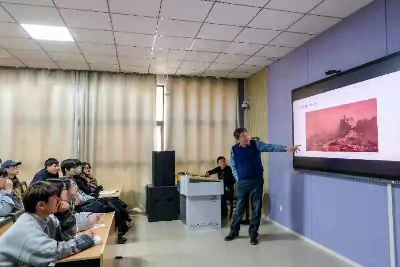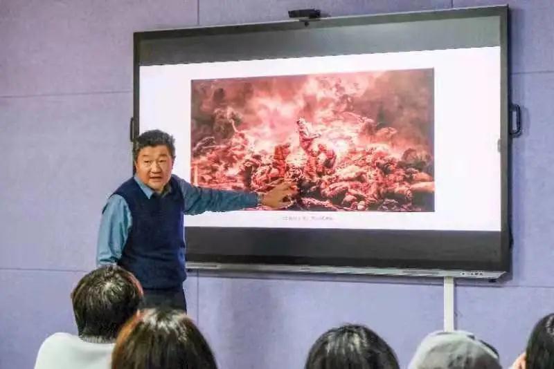 徐青峰聚焦主题性美术创作,阐释了主题性绘画的概念、源流、发展历程。他指出,主题性绘画要立足时代发展,关注历史事件和有一定影响力的社会现实,做到形式与内容、历史与现实、审美与思想的统一。徐青峰以《血战台儿庄》为例,分析了主题性绘画的当下意义和创作经历。他强调,艺术创作要反映时代精神,深入生活、扎根人民,在广泛调研、充分储备的基础上才能创作出无愧于时代和人民的艺术作品。他语重心长地勉励同学们要保持对艺术的热爱,以高标准要求自己,打牢基本功,坚持正确方向,发挥优势,克服缺点,在老师指导下理清创作思路,集中力量做好毕业创作;要主动走进历史、走进生活深处,体悟历史力量、吃透生活底蕴。