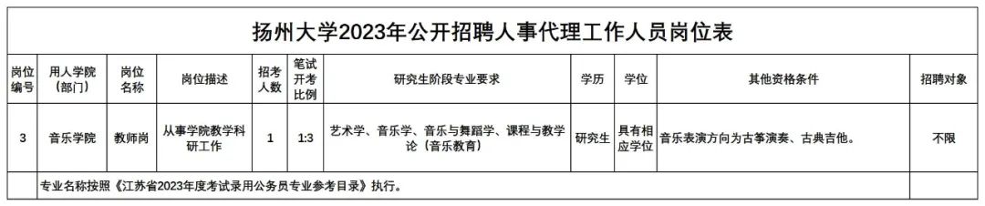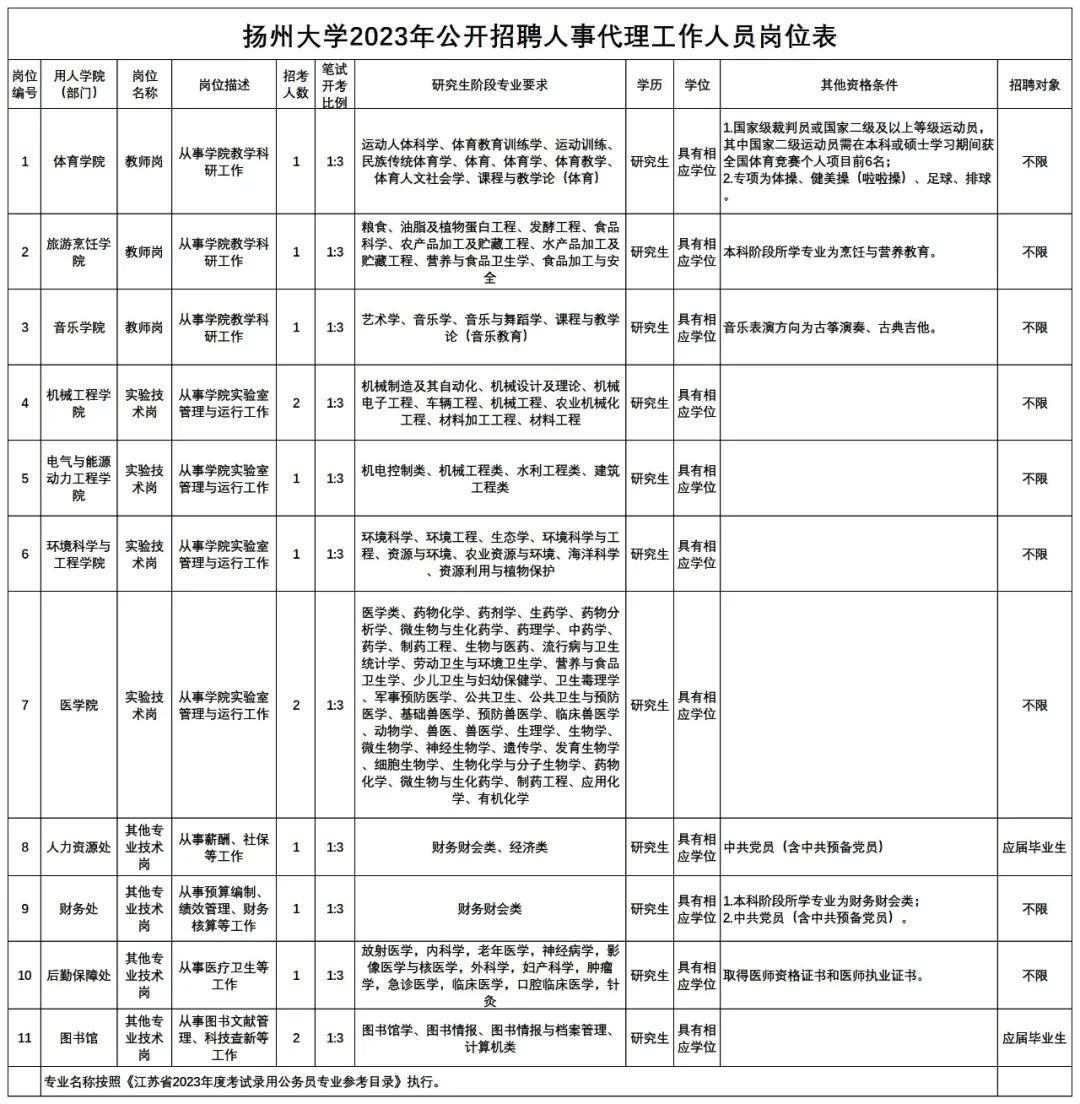 4. 各招聘岗位的笔试开考比例为1:3,如未达到开考比例,将核减或取消该招聘岗位,并在扬州大学人力资源处网站公告。应聘被取消岗位的人员可补报其他符合条件的岗位。