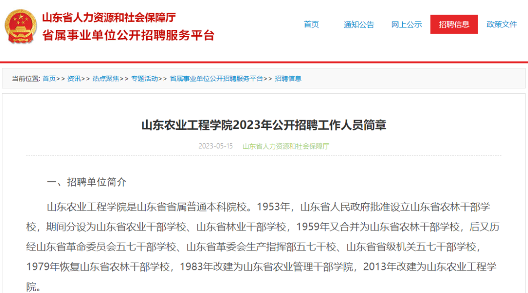通过省人力资源社会保障厅网站(http://hrss.shandong.gov.cn/)和山东农业工程学院网站(http://www.sdaeu.edu.cn)面向社会发布招聘信息。