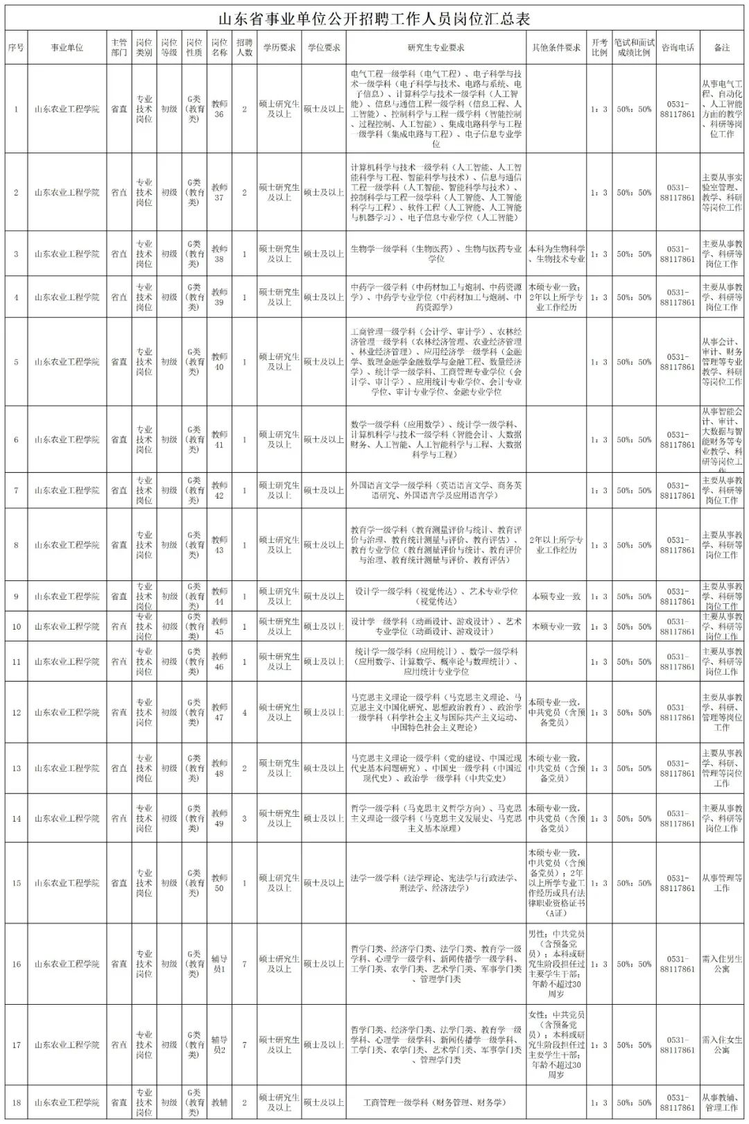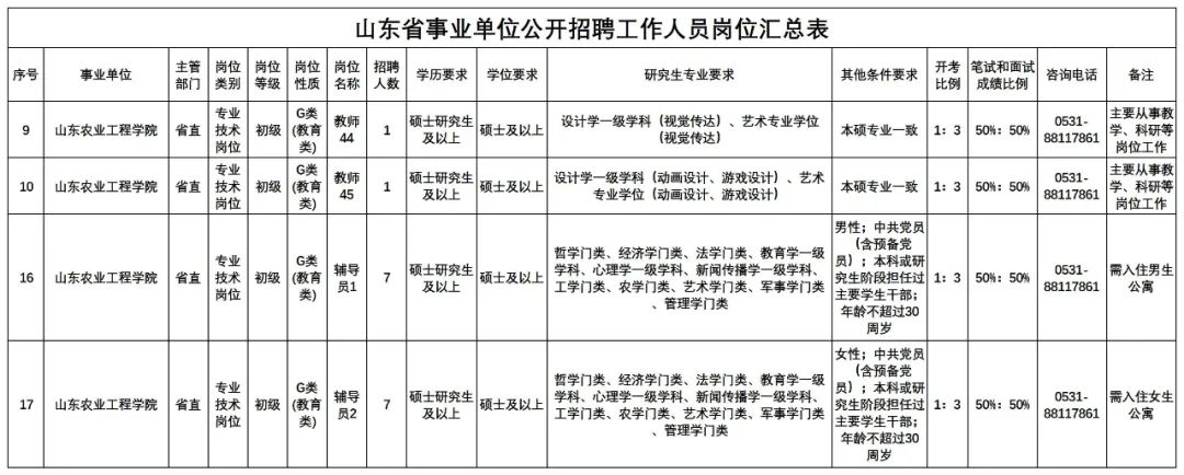 根据中共山东省委组织部、山东省人力资源和社会保障厅《关于印发2023年度省属事业单位公开招聘工作实施方案的通知》(鲁人社发〔2022〕23号)要求,结合工作需要,山东农业工程学院拟面向社会公开招聘初级专业技术岗位工作人员39人,岗位及条件详见《省属事业单位公开招聘工作人员岗位汇总表》(附件1)。