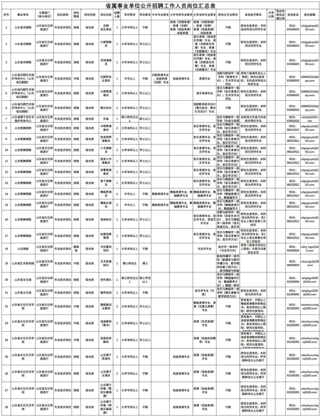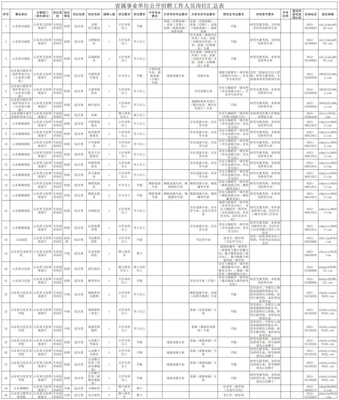 根据省委组织部、省人力资源社会保障厅《关于印发2023年度省属事业单位公开招聘工作实施方案的通知》(鲁人社发〔2022〕23号)要求,结合工作需要,省文化和旅游厅所属山东省京剧院等10家事业单位拟面向社会公开招聘初级专业技术人员27名,中级专业技术人员10名,副高级专业技术人员1名。具体岗位及条件详见《山东省文化和旅游厅所属事业单位公开招聘工作人员岗位汇总表》(附件1)。