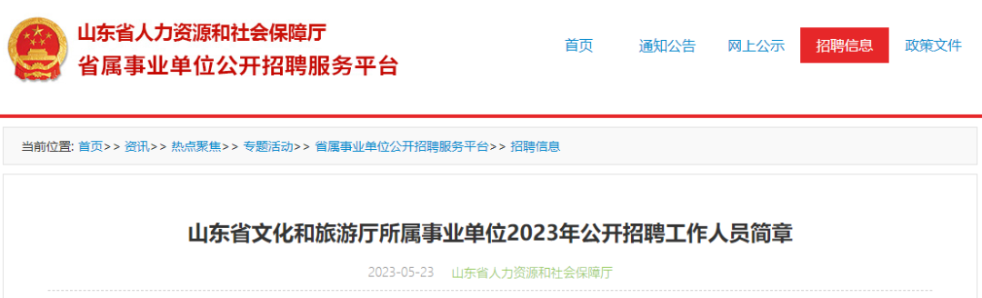 通过山东省人力资源和社会保障厅官方网站(http://hrss.shandong.gov.cn/)和山东省文化和旅游厅官方网站(http://whhly.shandong.gov.cn/)面向社会发布招聘信息。