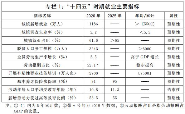 ——就业形势总体平稳。城镇新增就业5500万人以上,努力实现更大规模,城镇调查失业率控制在5.5%以内,重点群体就业保持稳定。城乡、区域就业机会差距逐步缩小,劳动力市场供求基本平衡。