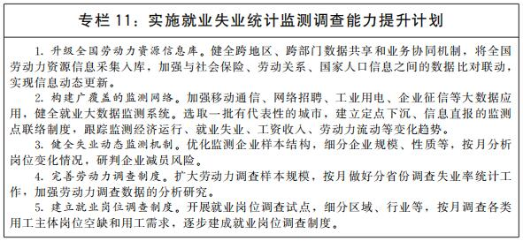 完善就业失业统计监测调查体系。加快构建系统完备、立体化的就业失业监测网络,实现劳动力市场、企业用工主体和劳动者个体全覆盖,全面反映就业增长、失业水平、市场供求状况。完善就业统计指标体系和调查统计方法,探索进行就业质量、就业稳定性等方面的分析。推进大数据在就业统计监测领域的应用。