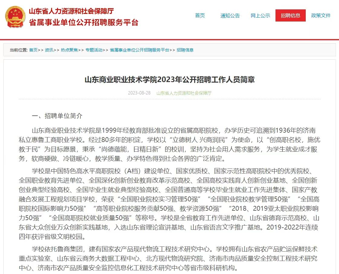 通过山东省人力资源和社会保障厅门户网站(http://hrss.shandong.gov.cn/)、山东省商业集团有限公司网站(http://www.lushang.com.cn)和山东商业职业技术学院网站(http://www.sict.edu.cn)面向社会发布招聘信息。