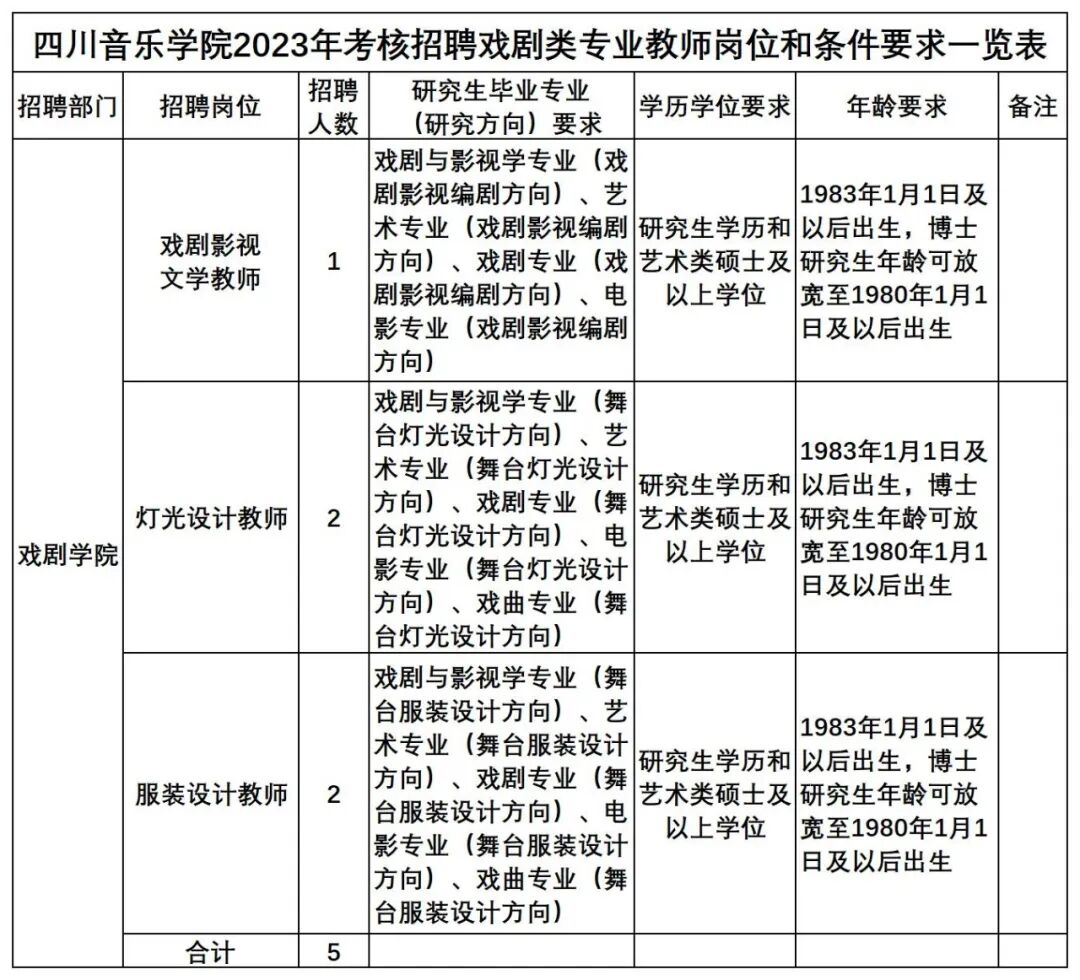 面向全国招聘2023年12月1日前取得普通高等教育研究生学历和相应艺术类硕士及以上学位,或2023年12月1日前取得教育部留学服务中心认证的国(境)外硕士及以上学历学位认证书,并完全符合《四川音乐学院2023年考核招聘戏剧类专业教师岗位和条件要求一览表》(含表注,以下简称《岗位和条件要求一览表》)相关岗位条件要求和本公告其他要求的人员。未在规定时间内取得并提供有关证书的,视为报考者自动放弃,责任自负。