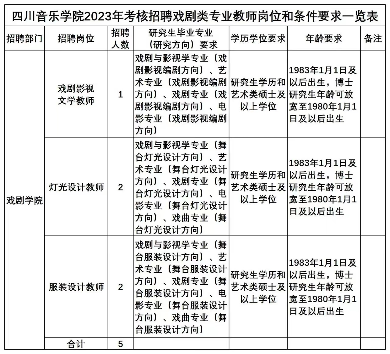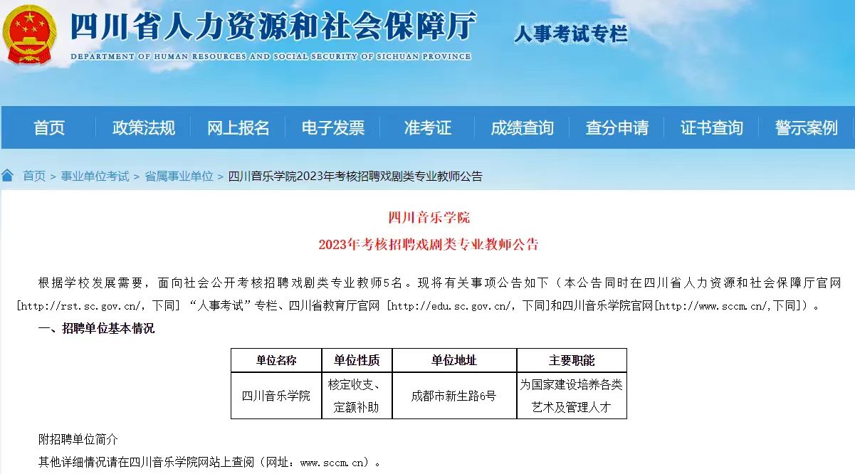 根据学校发展需要,面向社会公开考核招聘戏剧类专业教师5名。现将有关事项公告如下(本公告同时在四川省人力资源和社会保障厅官网[http://rst.sc.gov.cn/,下同] “人事考试”专栏、四川省教育厅官网 [http://edu.sc.gov.cn/,下同]和四川音乐学院官网[http://www.sccm.cn/,下同])。