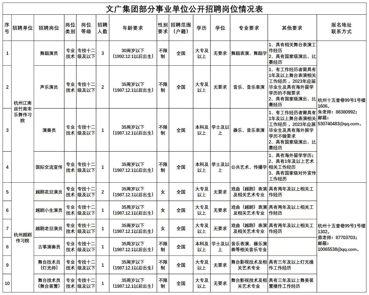 杭州江南丝竹南宋乐舞传习院、杭州越剧传习院招聘岗位、人数、具体要求、报名方式等信息详见《2023年杭州文广集团部分事业单位公开招聘岗位情况表》(见附件1)。