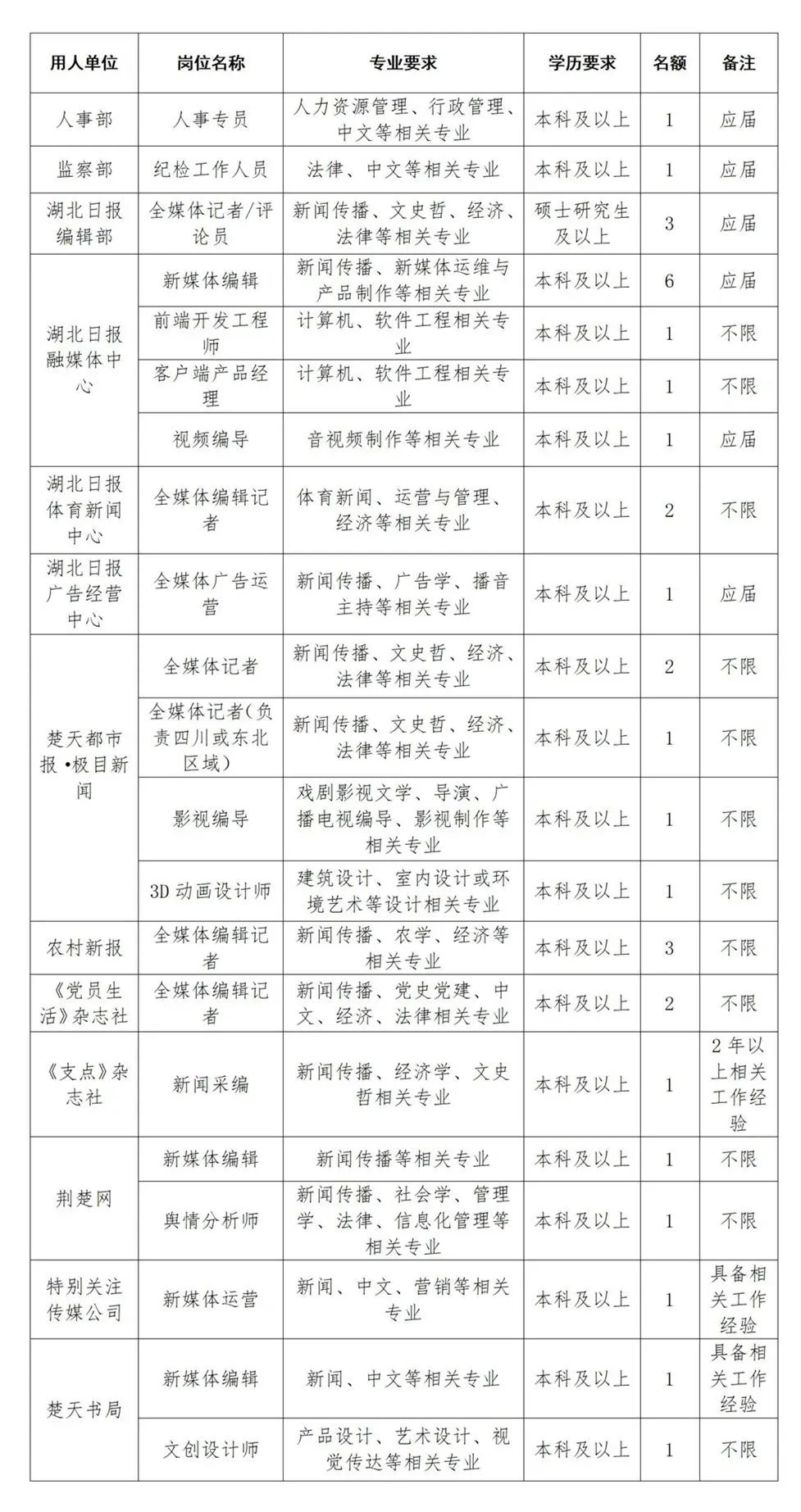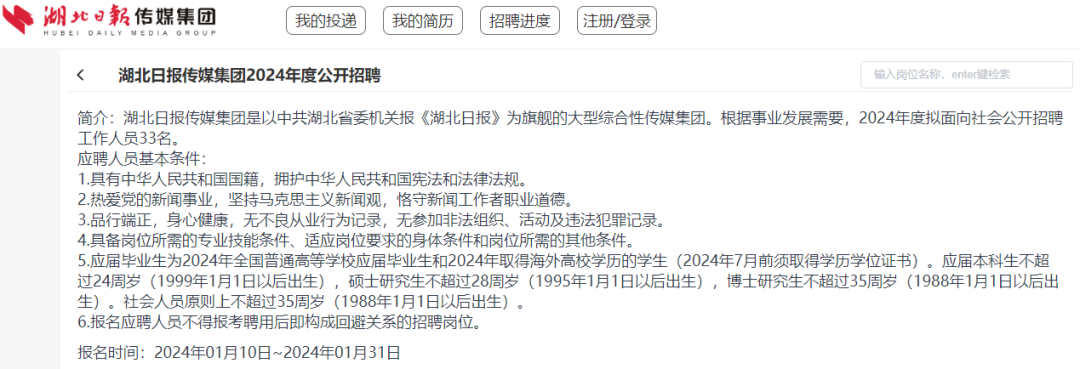 简介:湖北日报传媒集团是以中共湖北省委机关报《湖北日报》为旗舰的大型综合性传媒集团。根据事业发展需要,2024年度拟面向社会公开招聘工作人员33名。