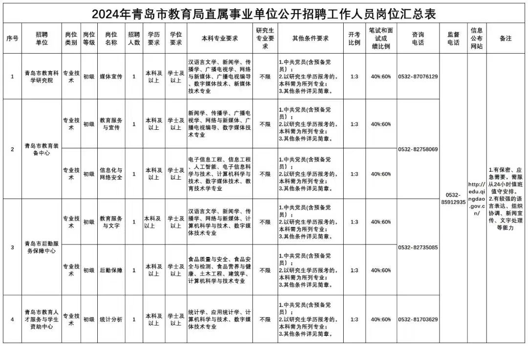 根据事业单位公开招聘有关规定,结合青岛市教育局直属事业单位岗位空缺情况和工作需要,2024年青岛市教育局部分直属事业单位面向社会公开招聘初级专业技术岗位工作人员6名(详见附件《2024年青岛市教育局直属事业单位公开招聘工作人员岗位汇总表》,以下简称《岗位汇总表》)。现将有关事项公告如下: