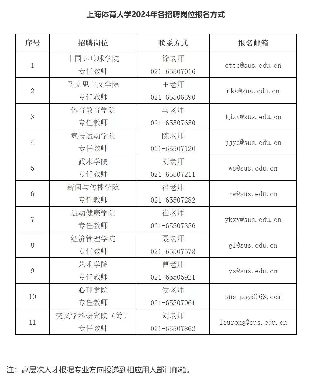 2、报名方式:应聘者填写《2024年上海体育大学应聘人员信息表(姓名+岗位)》(见附件),通过电子邮件(邮件主题为:应聘岗位+姓名)发送至各用人部门报名邮箱。