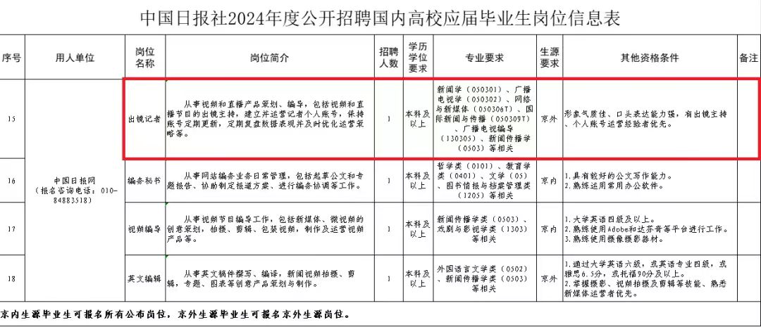 此次招聘涉及18个岗位、计划招聘27人,具体岗位及资格条件详见《中国日报社2024年度公开招聘国内高校应届毕业生岗位信息表》,京内生源毕业生可报名所有公布岗位,京外生源毕业生可报名京外生源岗位。其中,有关岗位专业条件参考教育部公布的专业目录(《普通高等学校本科专业目录》和《授予博士、硕士学位和培养研究生的学科、专业目录》)。报名应聘人员在报名时对专业有任何疑问的,可以直接拨打报名咨询电话进行咨询了解。