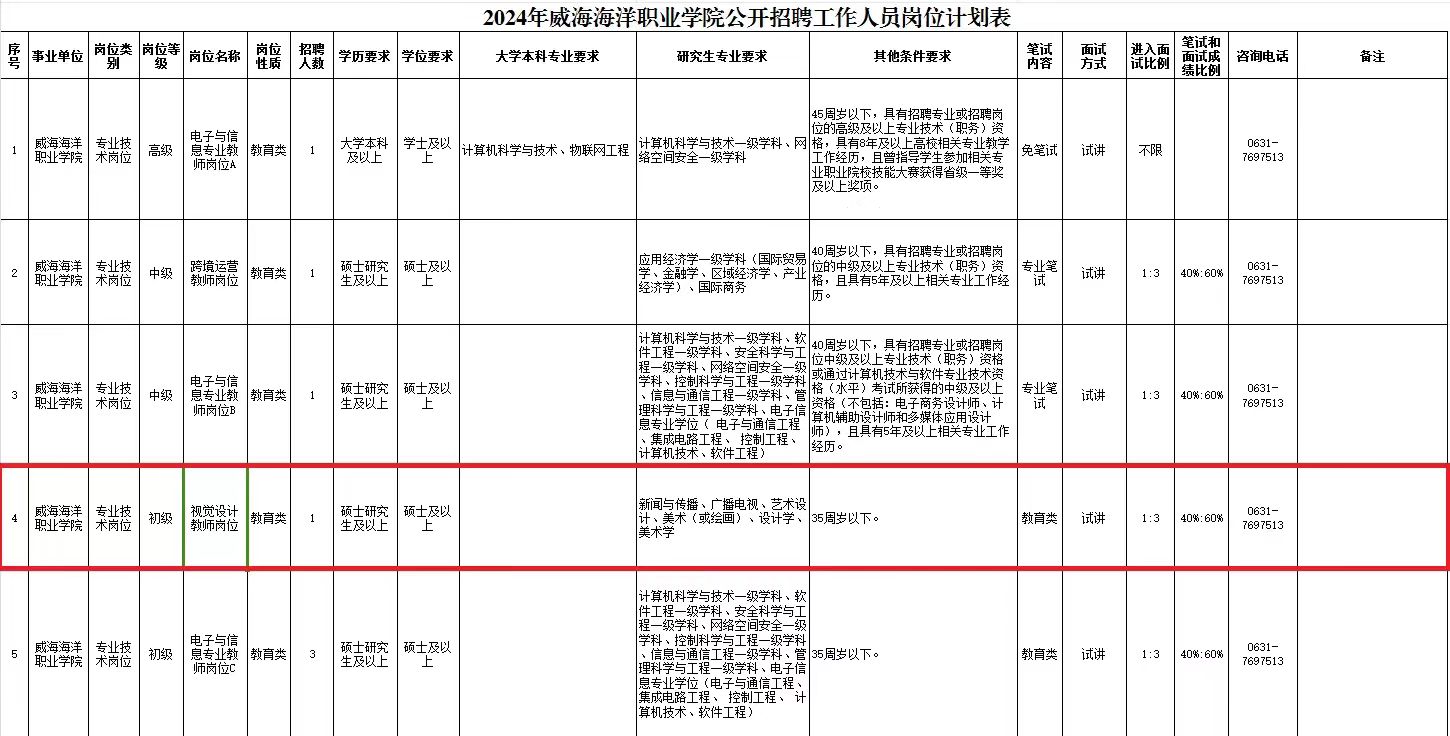 学院本次拟面向社会公开招聘工作人员30名。岗位条件、招聘人数等具体要求,见《2024年度威海海洋职业学院公开招聘工作人员岗位汇总表》(附件1,以下简称《岗位汇总表》)。