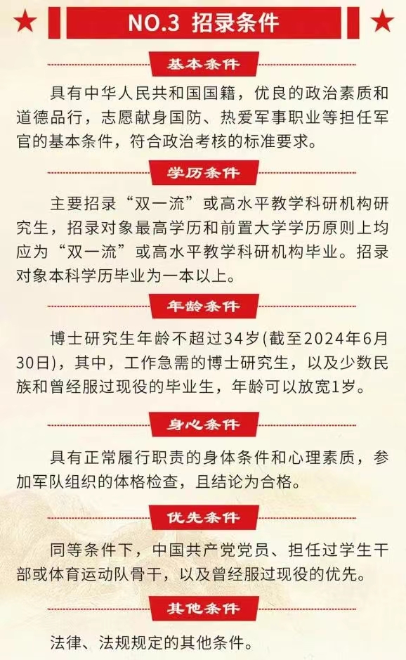 详细招录信息点击链接查看:2024年上半年军事科学院直接选拔招录军官公告