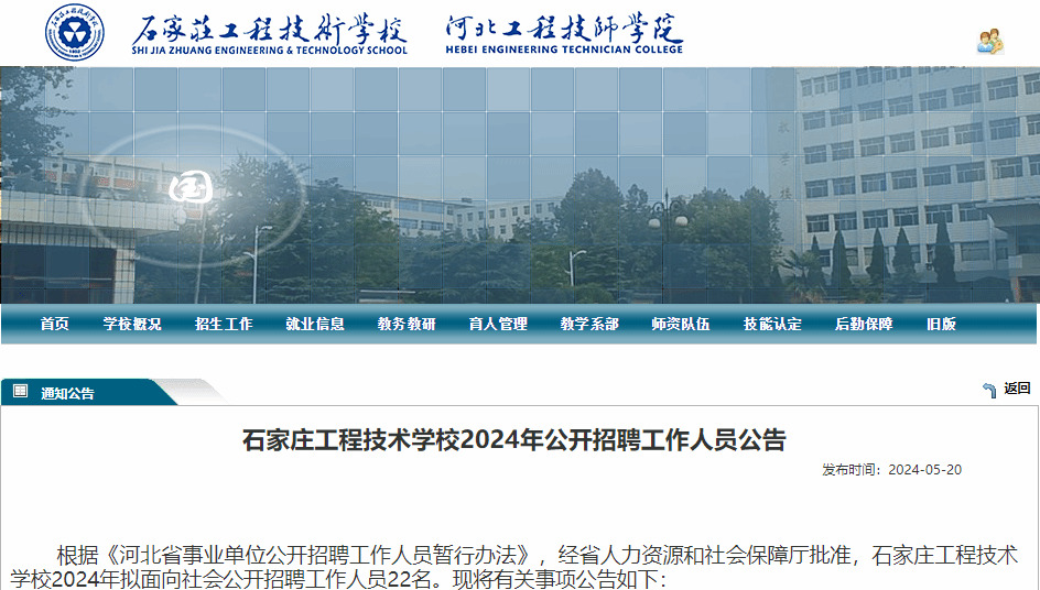 根据《河北省事业单位公开招聘工作人员暂行办法》,经省人力资源和社会保障厅批准,石家庄工程技术学校2024年拟面向社会公开招聘工作人员22名。现将有关事项公告如下: