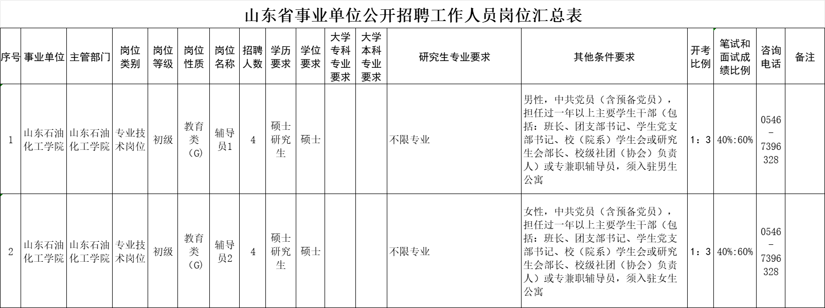 山东石油化工学院面向社会公开招聘工作人员16名。具体岗位及条件详见《省属事业单位公开招聘工作人员岗位汇总表》。