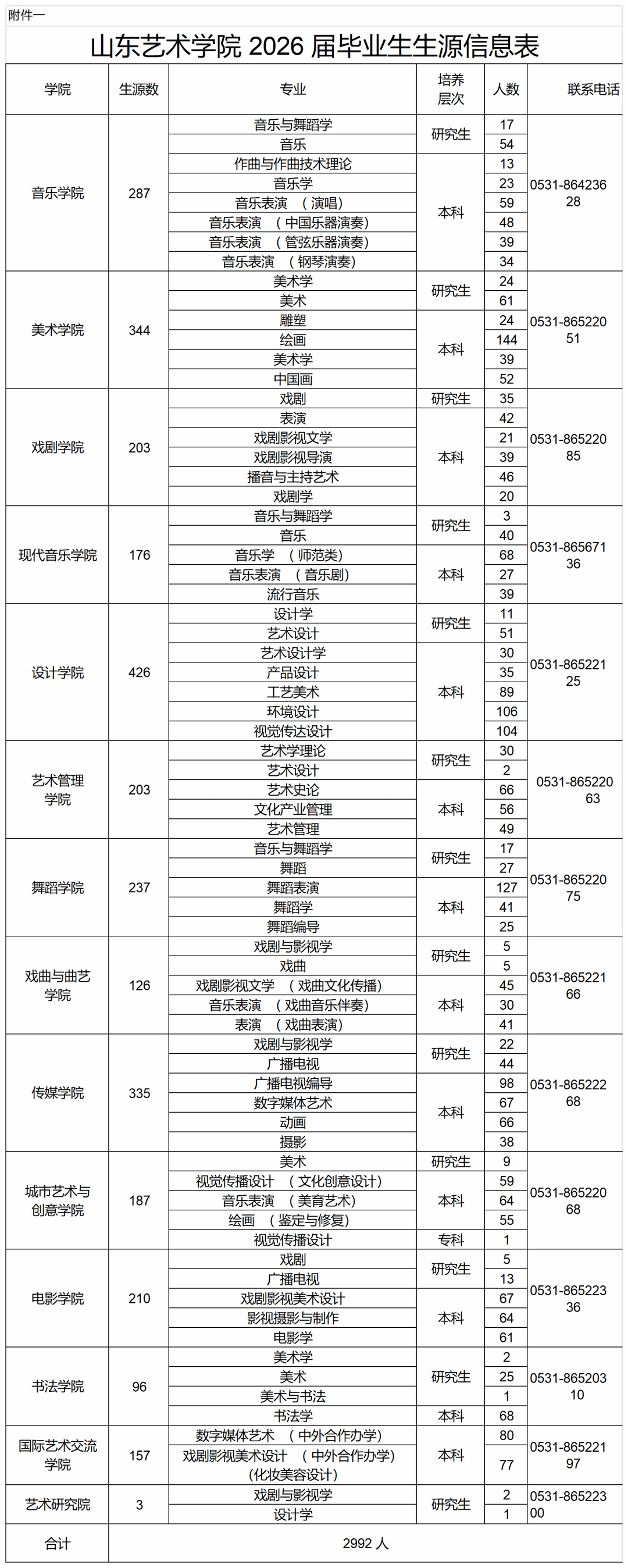 我校2026届毕业生预计总规模达2992名,其中研究生毕业生506名,本科毕业生2485名,专科毕业生1人。关于各专业详细分布及对应毕业生人数,敬请查阅《山东艺术学院2026届毕业生生源信息表》(附件1)。