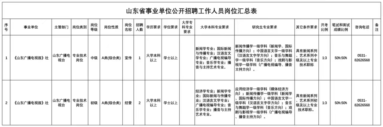 按照中共山东省委组织部、山东省人力资源和社会保障厅《关于印发2023年度省属事业单位公开招聘工作实施方案的通知》(鲁人社发〔2022〕23号)文件要求,结合工作需要,《山东广播电视报》社面向社会公开招聘工作人员3名:初级专业技术岗位2名、中级专业技术岗位1名。具体岗位及条件详见《省属事业单位公开招聘工作人员岗位汇总表》(附件1)。