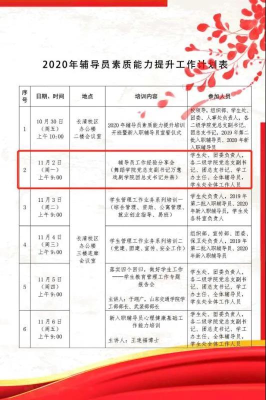 按照山东艺术学院2020年辅导员素质能力提升工作计划安排, 11月2日上午,我校在长清校区办公楼三楼连廊会议室举行辅导员工作经验分享会,学生处相关负责人,各二级学院党总支副书记、团总支书记、学工办主任、全体辅导员,学生处全体工作人员参加会议。