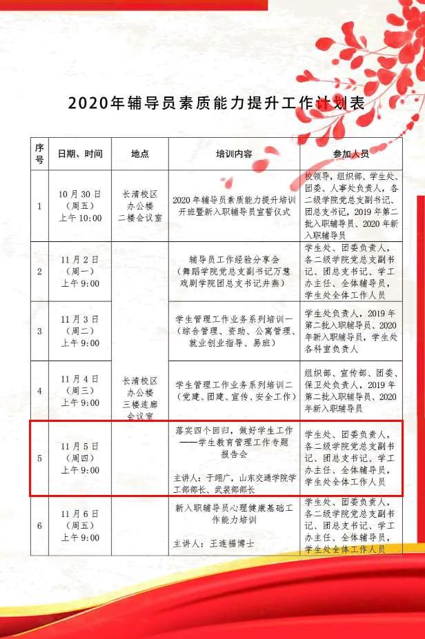 11月5日上午,根据山东艺术学院2020年辅导员素质能力提升工作计划的安排,我校在长清校区三楼连廊会议室举行“落实四个回归 做好学生工作”学生教育管理工作专题报告会,报告会特邀山东交通学院学工部部长、武装部部长于翊广主讲,各二级学院党总支副书记、团总支书记、学工办主任、全体辅导员、学工部全体工作人员参加报告会,报告会由我校学生工作部部长吕春玉主持。