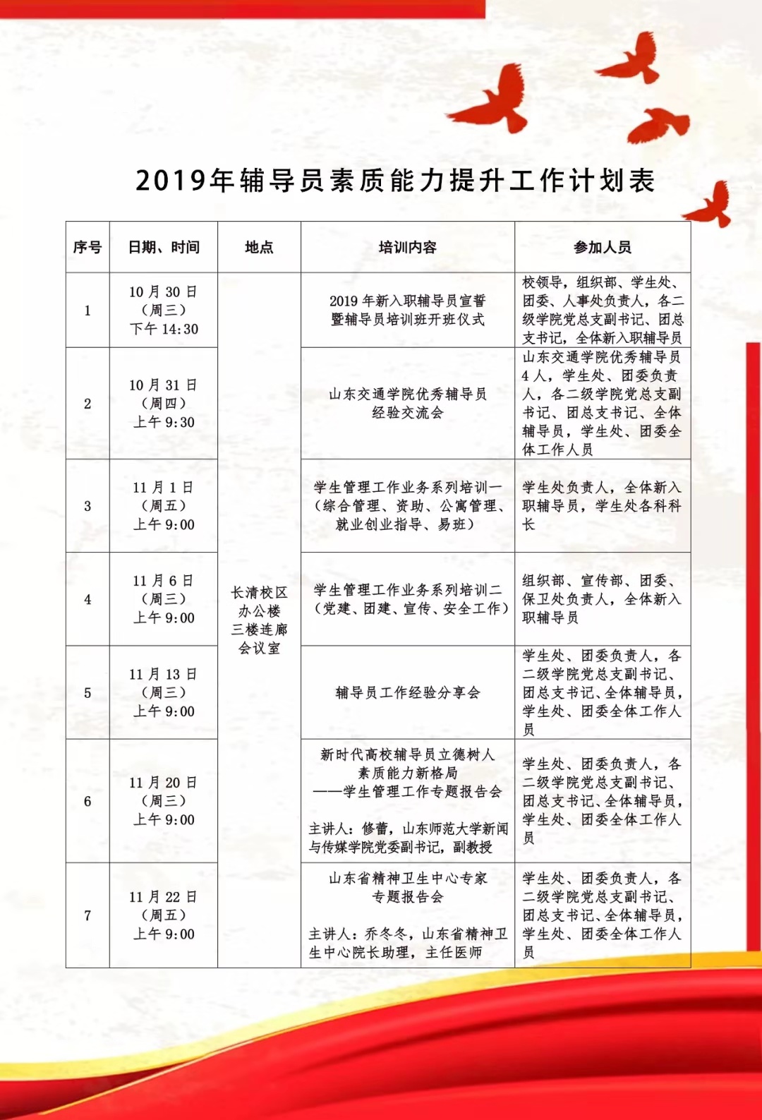 本次新入职辅导员宣誓暨辅导员培训班开班仪式,是我校2019年辅导员素质能力提升工作计划的一项重要内容,在接下来的一个月里,围绕提升辅导员特别是新入职辅导员的业务素质和工作能力,还将举行兄弟院校优秀辅导员经验交流会、学生管理工作业务系列培训、辅导员工作经验分享会、专家报告会等多项活动。