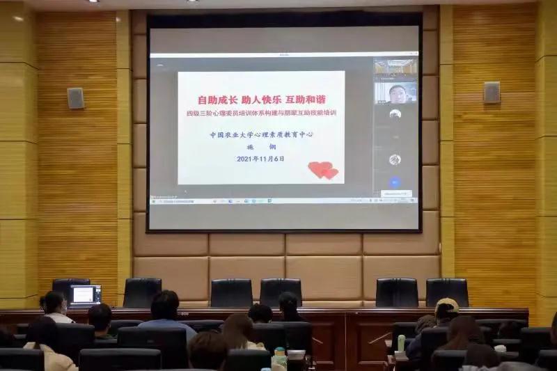 2021年11月6日上午8:30分至11:30分,学生处心理健康教育中心在长清校区二楼报告厅,举办山东艺术学院校级朋辈心理辅导员的“四级三阶心理委员培训体系构建与朋辈互助技能培训”专题讲座。心理健康教育中心相关老师,山艺阳光心理协会全体成员参加了本次培训。培训特邀中国农业大学学生心理素质教育中心施钢主任担任主讲。培训采用线上形式,通过腾讯会议平台完成。