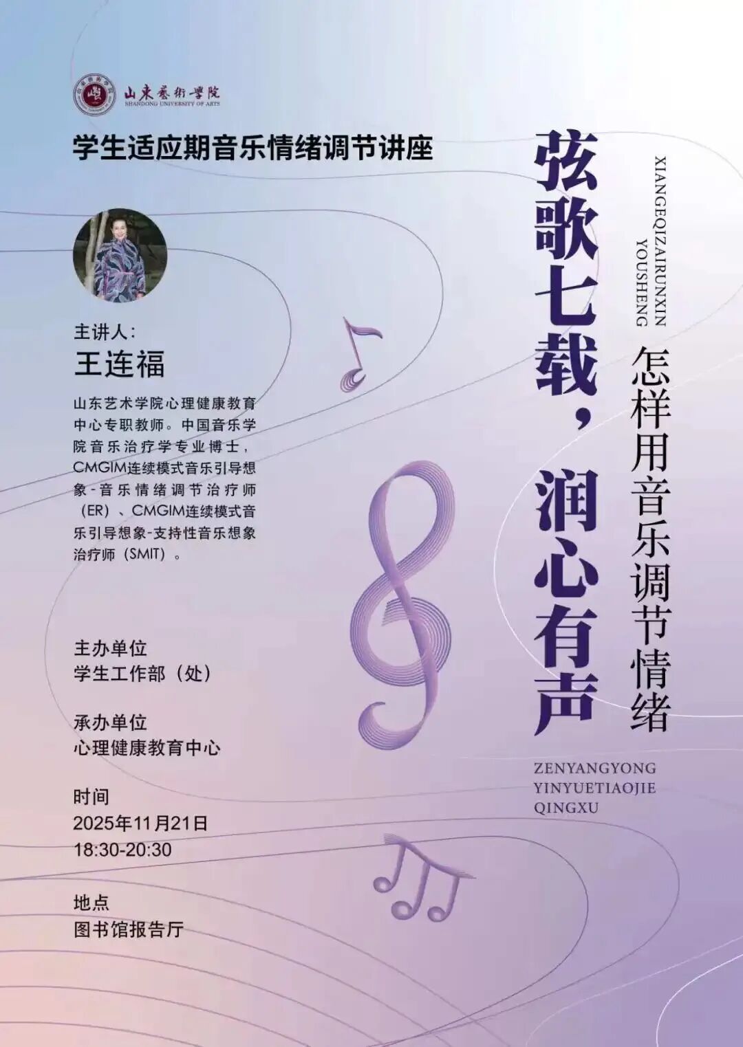 作为学校心理健康教育普及与预防体系建设的重要一环,我校心理健康教育中心近期面向2025级全体学生开展了“弦歌七载,润心有声——音乐情绪调节专题讲座”。音乐治疗主题讲座自2019年首次推出以来,已连续举办七年,形成覆盖全体新生、注重音乐治疗相关减压方法的传递、突出普及预防的心理健康教育品牌项目。