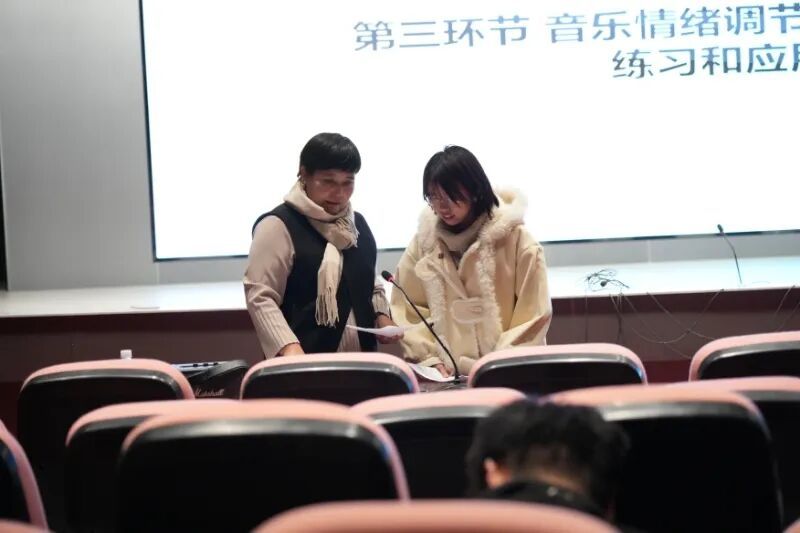 作为综合类艺术院校,我校充分发挥音乐治疗等专业特色,将学科优势融入心理健康教育工作。本次讲座在延续以往理论知识讲解的基础上,进一步强化了“音乐情绪调节方法”的实践教学与现场掌握环节,着力提升学生的实际应用能力。讲座紧密围绕入学初期学生常见的心理适应议题,设置“成长与调适”、“音乐与情绪”、“心理工具箱构建”三大板块,通过系统讲解与沉浸式体验相结合的方式,引导学生在聆听、互动与分享中掌握音乐情绪调节的操作方法与实用技巧,切实增强心理自助能力。